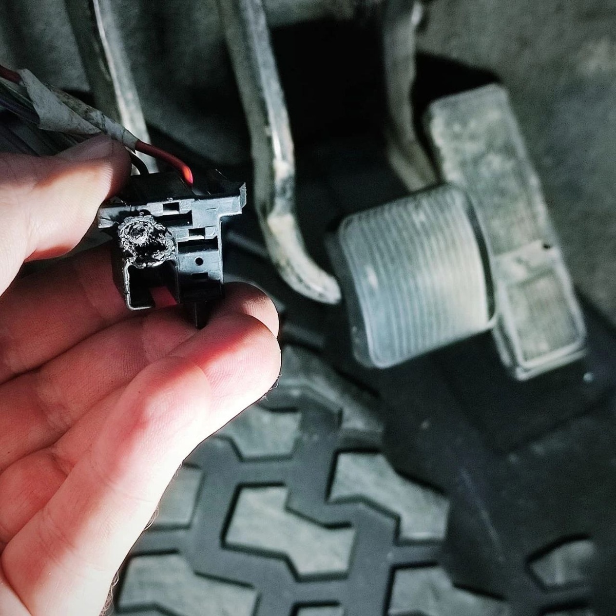 ПРОПАЛ БЛИЖНИЙ СВЕТ JEEP WRANGLER YJ? А дальний и габариты при этом работают? Проверьте вот эту фишку на рулевой колонке. Сумрачный заокеанский гений зачем-то посадил два провода от ламп ближнего света на один контакт, все это греется и приводит к тому, что вы видите на фото. Косвенный признак плохого контакта здесь - греется клавиша включения фар. На времянку выломал кусачками оплавленный контакт, обжал провода на новую клемму, замотал синей изолентой и поставил обратно. Ближний свет появился, клавиша фар не греется. Заказал с ROCKAUTO новую фишку (18 баксов) и контактную группу на рулевую колонку в запас (она там называется dimmer switch) за 28 баксов от STANDARD MOTOR PRODUCTS. Были и дешевле, но там наверняка голимый Китай. А вообще, видимо придется поставить реле на фары, эта переделка известна давно и позволяет разгрузить dimmer switch, предотвратив проблемы с оплавлением контактов в будущем. Хотя, оно проездило же как-то 30 лет 🤔 @grosstractor