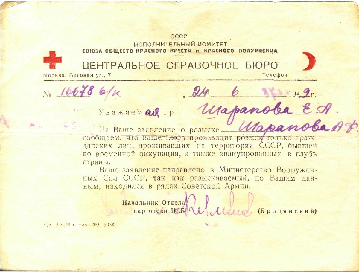 У меня просто тупик по прадеду по материнской линии. Известно несколько данных: Шарапов Андрей Федорович, 1916 г.р., на 1941 год он женился и проходил службу в 921 сп 249 сд в городе Вышний Волочек Калининской (ныне Тверской) области. Откуда он родом и каким военкомат был призван неизвестно, как и его дальнейшая судьба. У моей бабушки хранится ответ из Красного Креста от 24.06.1949 года о розыске Шарапова А.Ф. Был ли получен ответ из Минобороны неизвестно. Также есть свидетельство о регистрации брака Шарапова А.Ф. с Сергеевой Елизаветой Алексеевной (моей прабабушкой) в г. Вышний Волочек Калининской области 14 ноября 1941 года. На запрос о получении сведений о Шарапове А.Ф. Вышневолоцкий ЗАГС ответил, что Шарапову А.Ф. на момент брака 26 лет, значит он 1916 г.р., и он служил в 921 РККА. 921 сп входил в состав 249 сд, которая за освобождение Андреаполя, Торопца, Старой Торопы в феврале 1942 г. была награждена Орденом Ленина, а в марте 1942 г. стала гвардейской 16 гв. сд (917 сп – 43 гв.