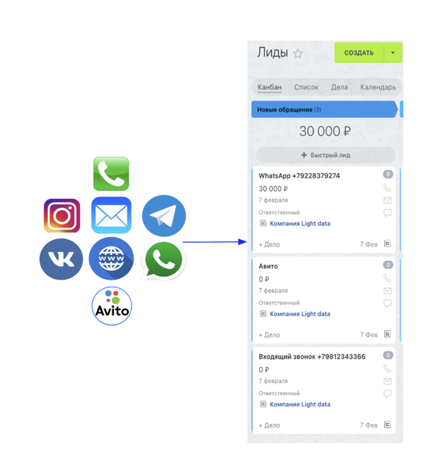 С Битрикс24 всё иначе: подключенные каналы (телефония, электронная почта, сайт, мессенджеры, соцсети, доски объявлений) = автоматическое создание лидов в CRM.