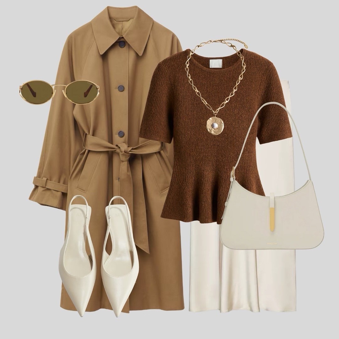 Осень прощает меньше, чем лето: фактуры становятся заметнее, а цвет — критичнее. На фото — образ, где каждый элемент работает на фигуру и «дорогой» эффект без логотипов: карамельный тренч, шоколадный трикотажный топ с баской, молочная атласная миди-юбка, остроносые slingback-лодочки и светлая сумка-багет. Завершает картину золотая цепь-медальон и овальные очки в металле. Разберём все детали по пунктам — от посадки и материалов до адаптации под погоду и тип фигуры.
