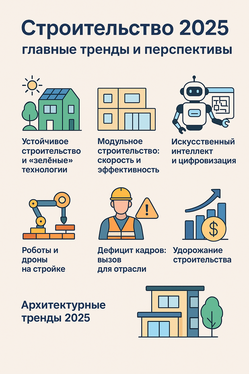 Строительная отрасль в августе–сентябре 2025 года переживает активные изменения. Экологичные материалы, модульные дома, цифровизация и искусственный интеллект формируют новые стандарты. В этой статье мы разберём главные тренды строительства 2025 года, которые уже находятся в топе популярности. Сегодня «зелёное строительство» перестало быть модой — это необходимость.