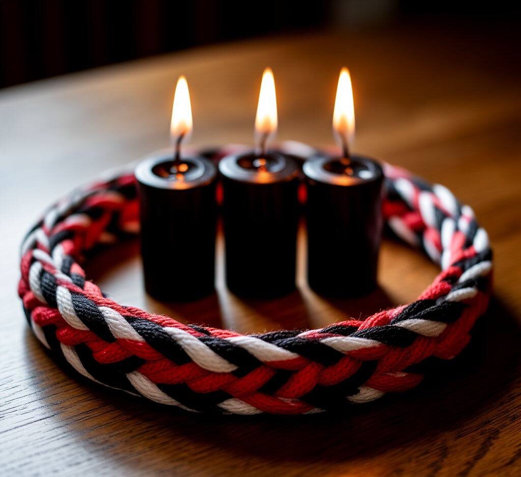 Купите 3 толстых веревки - черную, красную и белую. Придя домой, положите их вертикально перед собой. Посредине пусть лежит черная свеча, справа - красная, а слева - белая нить. За ними впереди, дальше, возожгите 3 черных свечи, а под нити положи фото того, на кого защита ставится.