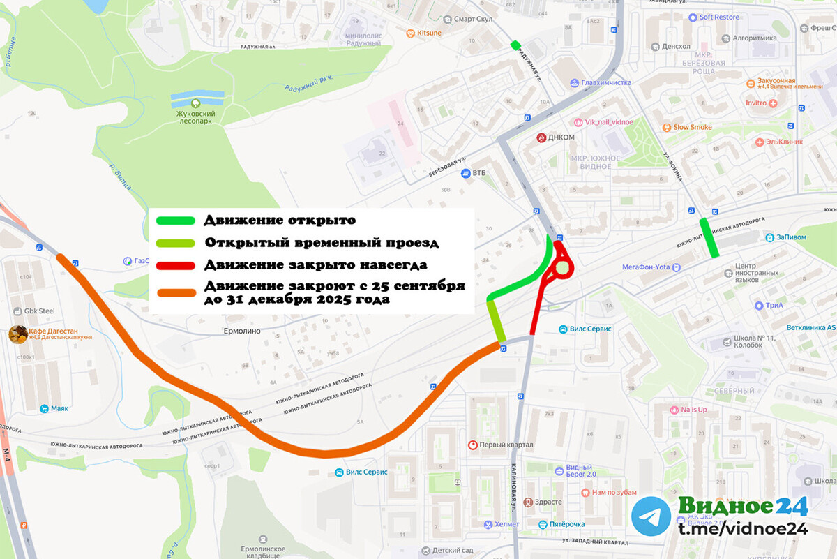 24 августа был открыт прямой проезд в жилой комплекс «Эко Видное» по улице Фокина по крыше тоннеля строящейся автодороги «ЮЛА». Одновременно с этим был перекрыт проезд с улицы Ермолинская на улицу Калиновая через круговое движение, но открыт новый проезд на дорогу-выезд на М-4 «Дон» и Донбасскую улицу, которая соединена с улицей Калиновая. То есть связь улицы Ермолинская с микрорайоном Купелинка сохранена, но движение осуществляется по новой схеме. Также стали известны новые сроки закрытия дороги-выезда на М-4 «Дон» и Донбасскую улицу. Теперь ее планируют закрыть с 25 сентября по 31 декабря 2025 года. Напомним, эту дорогу планируют расширить до 4-6 полос и соединить со строящейся автодорогой «ЮЛА». Подробную схему смотрите здесь.