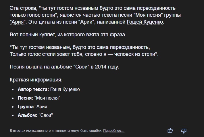 На летнем концерте. проходившем в середине августа на экоферме "Полесье", услышали мы от Ольги Серебряной песню про степь "неизвестного автора". Ну, в том смысле, что имени автора она не знала, знала только, что он когда-то работал в экспедиции в Казахстане. Ну, подумали мы, в наше-то время в Интернете найти можно практически все. Набираем цитату - и получаем ответ, что это песня группы "Ария", написанная Гошей Куценко и вошедшая в альбом "Свои". Отложив пока вопрос об отношении Гоши Куценко к группе "Ария", решили для начала найти этот альбом. Возможно, там будут указаны авторы - и наши изыскания на этом завершатся. И вот второй ответ искусственного интеллекта: Так и хотелось крикнуть: "Кто имел в виду? Мы от тебя же про этот альбом и узнали!" Но такое и по по отношению к людям иногда бесполезно, а уж к искусственному интеллекту - и подавно.