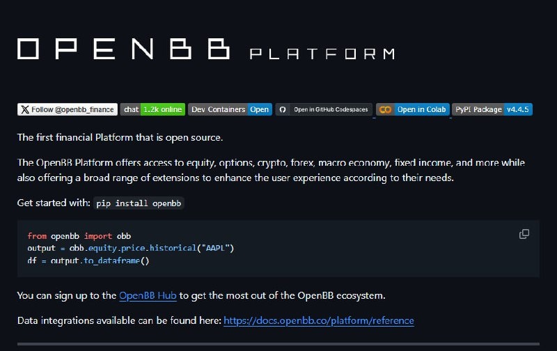 💰OpenBB — это открытая финансовая платформа с открытым исходным кодом, предназначенная для аналитиков, квантов и агент-ИИ. Платформа предоставляет доступ к данным по акциям, опционам, криптовалютам, форекс, макроэкономике, облигациям и прочему, предлагая единый, стандартизированный API для работы с разнообразными поставщиками данных. Основыне особенности: 🔵Открытая платформа для финансовой аналитики 🔵Унифицированный API для работы с разными источниками данных 🔵Поддержка Python-библиотеки, CLI и Web API 🔵Модульная архитектура с расширениями 🔵Стандартизированный объект результата OBBject 🔵Интеграция с OpenBB Workspace (графический интерфейс) 🔵Возможность использования AI-агентов для автоматизации исследований 🔵Активное сообщество и регулярные обновления ➡️Установка: pip install openbb 📱 Репозиторий ⚙️ Документация ➡️Справочник Программиста. Подписаться