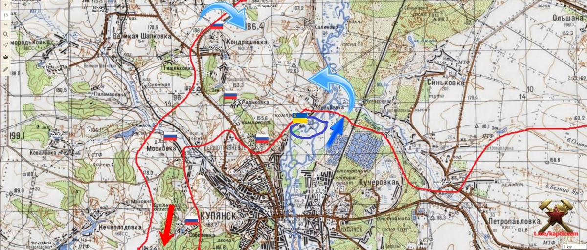 В ответ на пост Охват Купянска Противник сохраняет небольшое присутствие на западном берегу Оскола у Голубовки и пытается это использовать. ВСУ ведут атаки между заброшенными отстойниками и заболоченным приречьем Оскола, с целью прорваться за р.Гнилица и далее охватом с севера Голубовки, вряд ли дальше. В случае успеха, вполне могут попытаться встречным ударом деблокировать Купянск и отрезать наш охват по западному берегу Оскола. Сил у них, как в самом Купянском полукотле, так и на внешнем контуре предостаточно схемы и карты