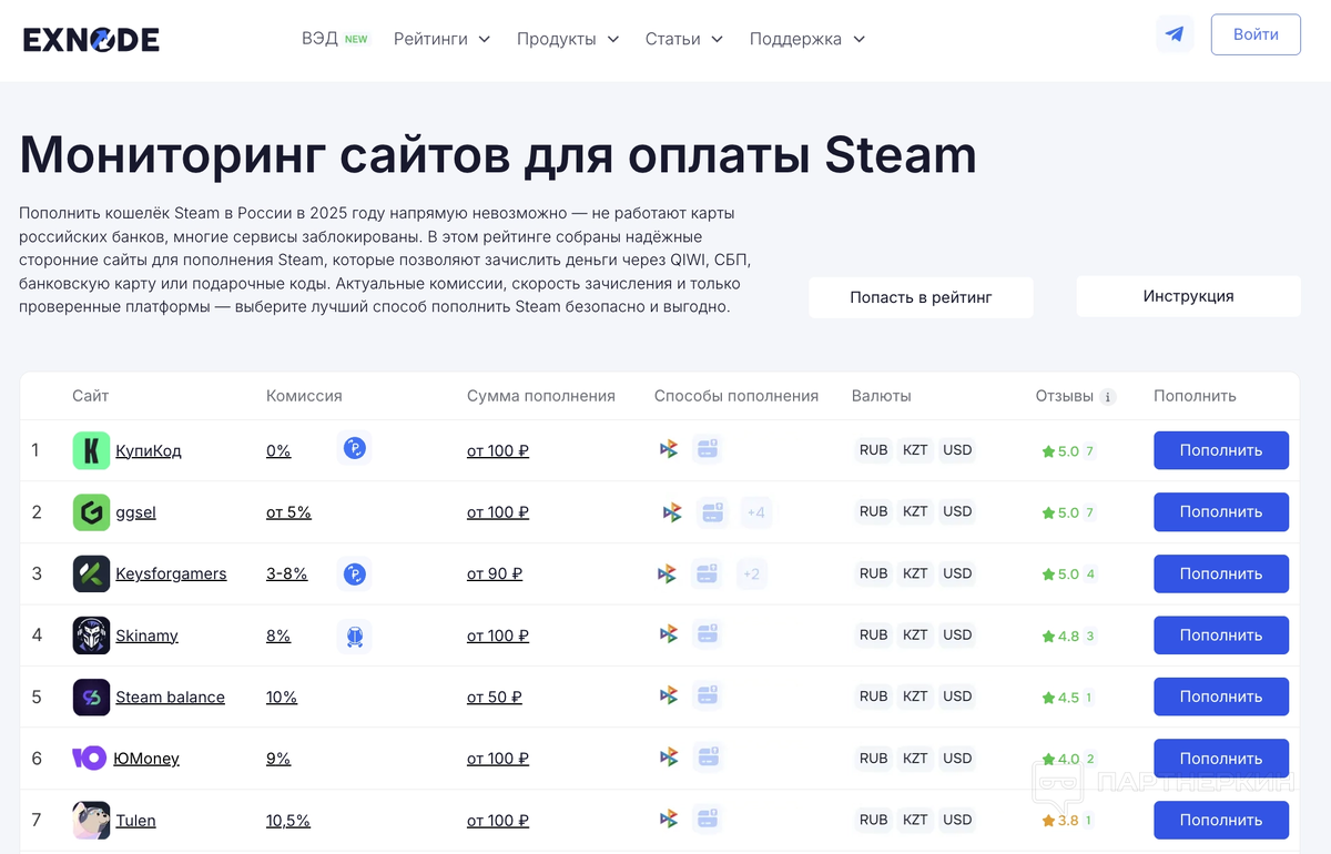 Если вы ищете, где можно пополнить стим без комиссии, то обратите внимание на платформу Kupikod с функцией Premium. Это на сегодняшний день самый надёжный способ без переплат. Также близки к 0% комиссии агрегаторы с конкуренцией между продавцами — GGSel, SteamStar, Buysub. Но там всё зависит от конкретного предложения. Поэтому всегда сравнивайте условия и проверяйте отзывы — лучше всего это делать через Exnode, где собраны все актуальные курсы, комиссии и рейтинги сервисов.