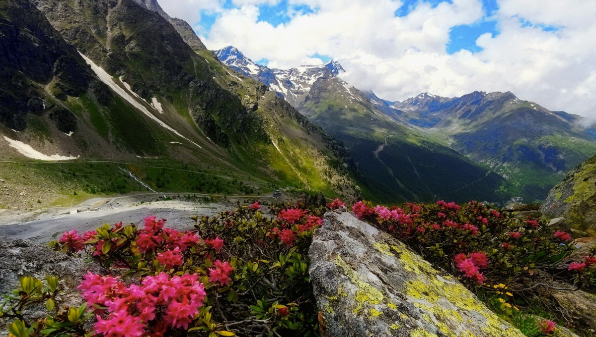 Вершины Домбая летом с видами на ледники и цветущие склоны
