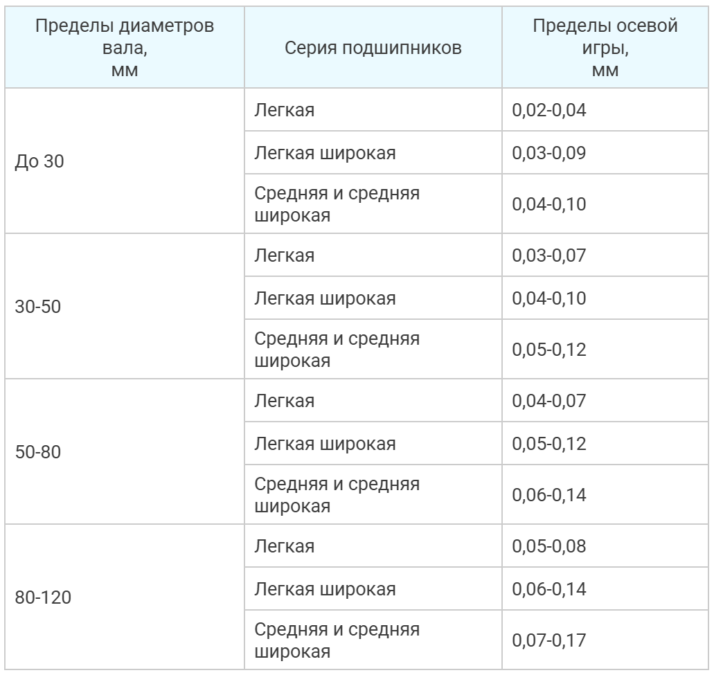 Если в узле обеспечена высокая точность расточки посадочных мест, расстояние между подшипниками невелико и нет опасения защемления тел качения, то следует выбирать нижние пределы осевой игры. Если вышеуказанные условия в узле не выполняются, то пределы осевой игры выбираются по представленным таблицам с учетом теплового удлинения вала.