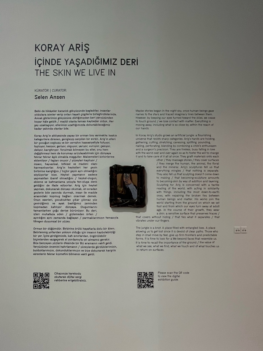 Этой весной мне удалось побывать на выставке в арт-пространства современного искусства в Стамбуле. В этот раз я расскажу про работы Корaя Ариша (Koray Ariş) — турецкого скульптора. Спускаясь по Arter c четвертого этажа на первый, с первых шагов начинаешь чувствовать, что пространство выставки вводит в особую атмосферу. Зал окутывает цикличный ритм — не музыка, а скорее пульсация, похожая на механическое сердце искусственных джунглей или отзвук далёкого ритуала. Этот гипнотический музыкальный фон сбивает привычный аналитический настрой, настраивая на полное тактильное погружение. Воздух наполнен запахом кожи и дерева.