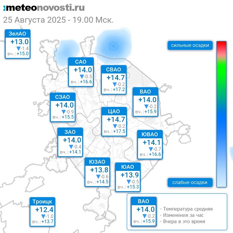 В 19:00 в Москве было от +12.2°C до +15°C, средняя температура +14°C #погода #Москва #лето #температура #25августа #понедельник Перейти на сайт Прогноз погоды на 14 дней