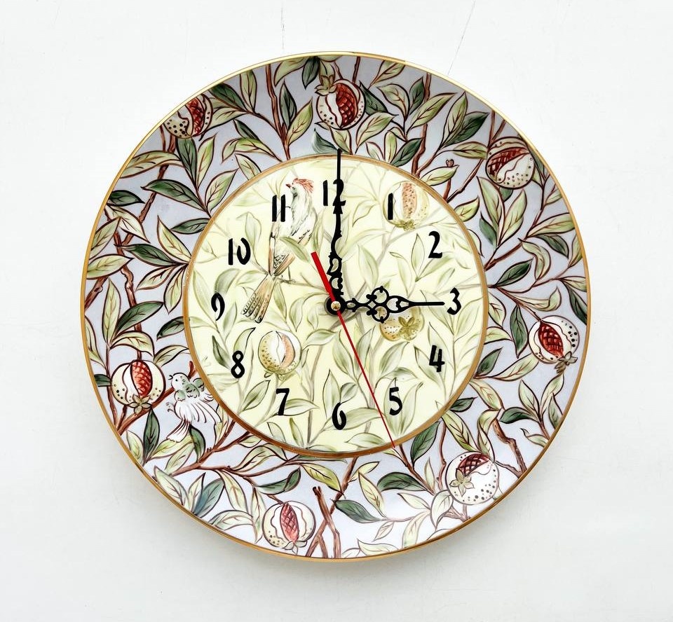 Много у меня набралось новинок из этой серии, и вот наконец показываю все в отдельной подборке... Роспись по мотивам моего любимого британского художника конца 19 века. Тема выбрана не случайно. Роспись на часах перекликается с принтом на шторах веранды в доме заказчицы. Моррис достаточно "пестрый" автор, поэтому для цифр предусмотрен отдельный, более светлый фон. В этой работе использован золотосодержащий препарат (12 процентов золота) - для окантовки. Моррис любит роскошь) Пара слов, как создаются такие круглые настенные часы. Берется обычная белая тарелка, фарфор, диаметр 25 или 30 см. И расписывается на заказ. По периметру рисуем циферблат, по центру делаем аккуратное отверстие для стрелок, с тыльной стороны крепится бесшумный часовой механизм и петля-подвес для крепления к стене. Дизайнерские настенные часы готовы. Остается только повесить на стену. Очень часто к часам заказывают и настенные тарелки. Вместе они образуют на стене композицию. Часы-тарелки обычно заказывают для