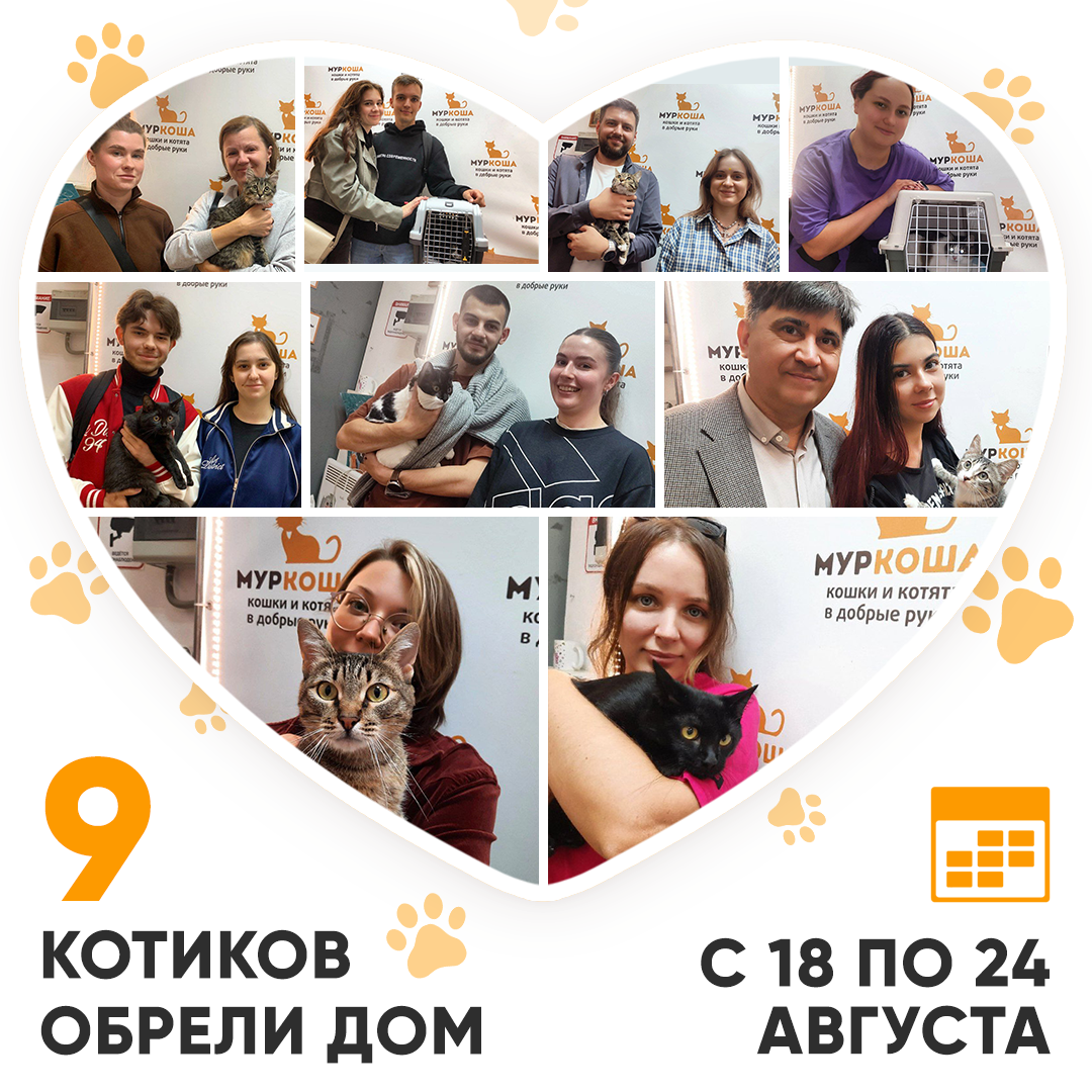 Друзья! Сегодня среда, и мы, как обычно, подводим итоги работы «Муркоши» за прошедшую неделю. Кто же стал счастливым выпускником Центра помощи кошкам «Муркоша» с 18 по 24 августа 2025 года? 😺 🥳 Итак, за прошедшую неделю домашними и любимыми стали 9 котиков! Активная Альчи прибыла к нам с улицы. А сегодня она весело проводит время в семье, которая недавно забирала домой нашу выпускницу Эспрессо! Милого Уютика нашли на улице. Спустя два месяца котик отыскал хозяйку и отправился домой, где уже живёт наш выпускник Баскет! Розовоносая Пандочка была домашней, однако в связи с обстоятельствами ей пришлось искать новое место жительства. В «Муркоше» Пандочка и встретила своё счастье! Малыш Нэш поступил в приют с передержки. Спустя всего месяц лапочка понравился людям, которые и забрали милого питомца домой! Котик со сладким именем Мафин раньше жил дома, но получилось так, что он оказался в приюте. Мы рады, что благодаря «Муркоше» у Мафина получилось найти свою судьбу! Готика нашли на улице