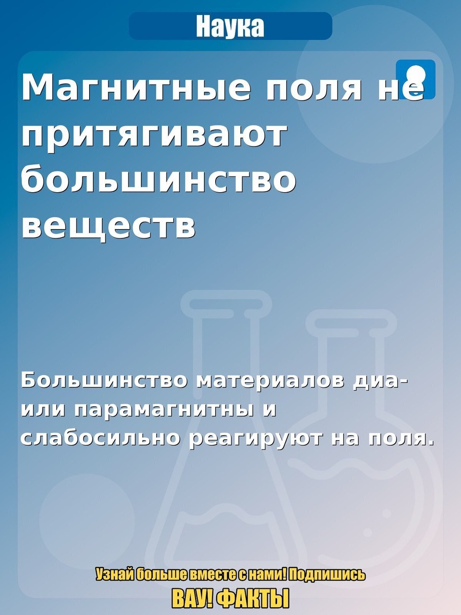 Магнитные поля не притягивают большинство веществ. Большинство материалов диа‑ или парамагнитны и слабосильно реагируют на поля. Интересный факт по теме «Наука»: Магнитные поля не притягивают большинство веществ. Почему так: Большинство материалов диа‑ или парамагнитны и слабосильно реагируют на поля.. Поделитесь в комментариях, знали ли вы об этом и стоит ли делать продолжение по теме. #наука #факты #интересно