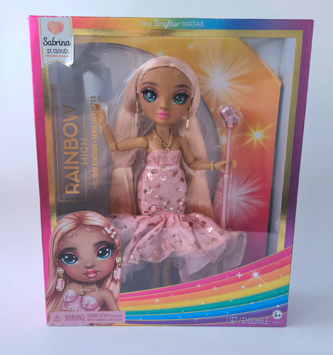 Бывают куклы, в которых вроде все прекрасно, а меня не торкает. А бывает Сабрина Снт (до сих пор не уверена, как это правильно по-русски должно писаться) Клауд, у которой косяк на косяке, а она все равно мне нравится. Вообще, эта кукла долго болталась на задворках моего вишлиста. Вроде красивая, а вроде персиково-оранжевых у меня и так довольно много (особенно сильно просится сравнение с Джорджией Блум, которая в моей коллекции появилась намного раньше). А потом она беспощадно подорожала, и я уже почти её вычеркнула, как мне попалась новость о перевыпуске. И, в конечном итоге, я все же решилась её взять. Начну с двух очевидных упрощений: отсутствует второй аутфит и шарниры в кистях. Оба эти факта хоть и печальны, но не так для меня критичны. Правда, цену за это производитель все равно скидывать не стал. Коробка у этого выпуска максимально простая. Если бы я не знала, что это перевыпуск, подумала бы, что это подделка. Какая-то вырвиглазная радуга спереди коробки. Зато задник максимал