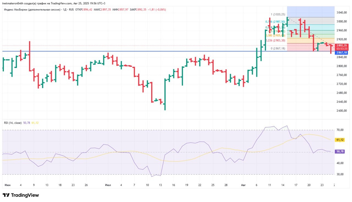 ❗️25 августа российский фондовый рынок снизился, индекс МосБиржи потерял 0,33% до уровня 2887,24