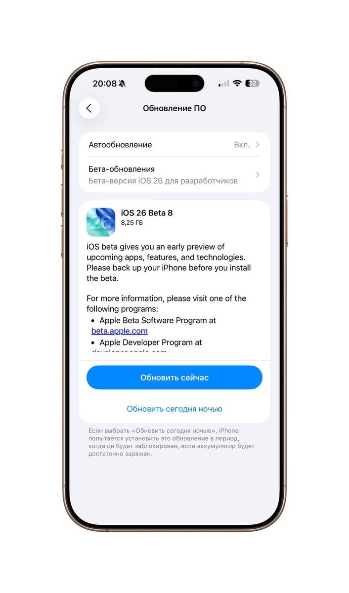 Apple выпускает Beta 8 iOS 26 Восьмые Beta версии всех систем уже доступны. Вероятно это последние бета версии перед презентацией. Презентация новых iPhone всё ближе, а значит и релиз новых систем совсем скоро. Beta версии для разработчиков и тестировщиков доступны после установки Профиля с сайта beta.apple.com Beta версии остаются рискованными, хотя и работают уже отлично. Как сделать откат на iOS 18
