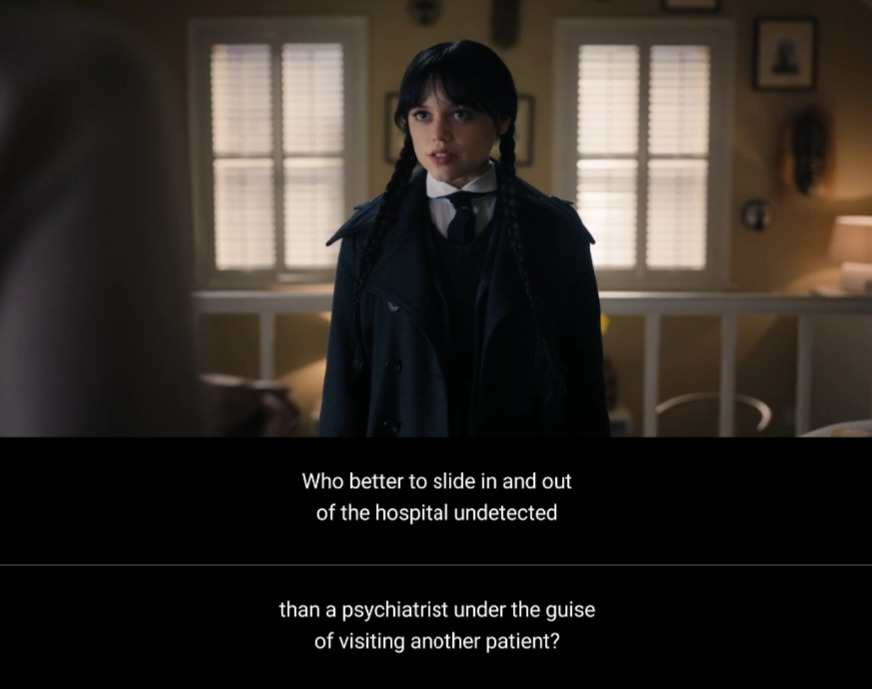 В полицейском участке 1×08 Тайлер признался, что ему понравилось убивать и сказал: «Звук их криков, паника в ее глазах». Но почему же Кинботт так выделяется? В чём причина особого отношения? Почему она кажется важнее остальных? Помните доктора Кинботт? Высококвалифицированного психиатра, которая пытается помочь Уэнсдей и Тайлеру своей жизнерадостной манерой поведения и необычным интересом к таксидермии. Впрочем, я не виню эту женщину, у всех нас есть свои странные интересы. Моё внимание привлекло предзнаменование в 1×07. Не думаю, что Уэнсдей была совсем уж неправа, когда думала, что раскрыла дело. Она определённо наткнулась на что-то; её направление и рассуждения были верны. Единственным неуместным фрагментом пазла была личность Лорел Гейтс. После того, как Уэнсдей выбежала из кабинета Кинботта, мы узнали, что Тайлер был в ванной. Вероятно, он прокрался туда, или уже был там и был тем самым «пациентом, нуждающимся в неотложной помощи», о котором говорила Кинботт. Некоторые могут утвер