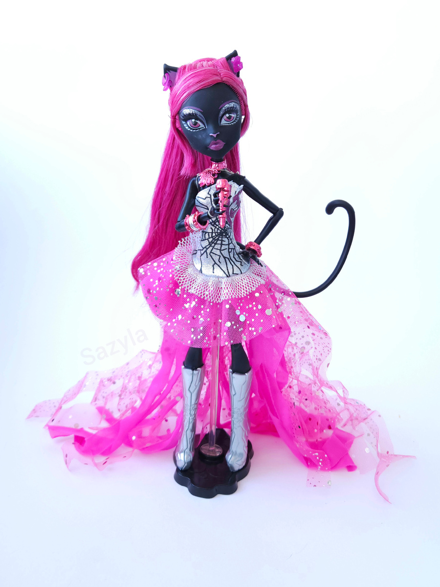 Несмотря на то, что моя коллекция кукол Торалей больше, из всех веркошек Monster high именно Кэтти Нуар нравится мне, как персонаж. Мне кажется, что её раскрыли больше всего, по итогу, посвятив её истории практически целую полнометражку. А начинала она как фоновая певица для пары клипов. Её отличительными чертами являются черный скинтон и волосы цвета фуксии.