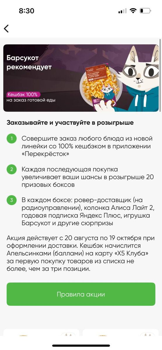 Сегодня прочитала на Дзене про акцию в Перекрестке — получи 100% кэшбэк за заказ любого блюда из новой линейки Барсукот. Я как раз вспомнила, что у меня с прошлой акции накопилось почти 8000 апельсинок, которые сгорают сегодня. Решила: отличный повод заказать еду, чтобы не пропали. Собрала корзину примерно на 3000 рублей, уже готова оформлять заказ и вижу: списать можно только 2000 апельсинок. Хотя в условиях написано, что можно оплатить до 50% суммы бонусами и максимум 3000 апельсинок. Но у меня корзина на 3000₽ — значит, половина суммы это 1500 рублей, то есть 15 000 апельсинок… а списывается только 2000. Как это работает? Кто-то знает? В итоге я решила ничего не заказывать. Потому что 9000 апельсинок от продукции «Барсукот», которые сгорят через 5 дней, мне точно не нужны. Честно? Очередной маркетинговый ход, который на деле не приносит выгоды. Вижу, что сейчас многие про эту акцию пишут. Можете объяснить, как вы собираетесь тратить такое количество баллов в такие короткие сроки?