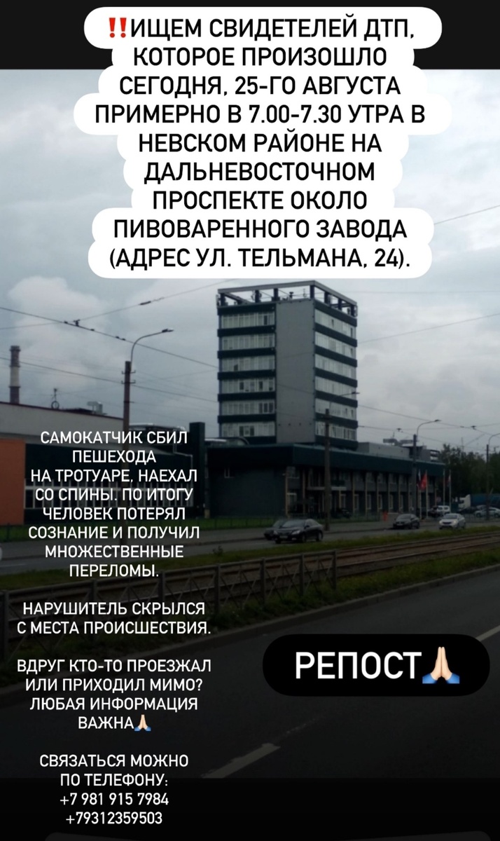 Ищем свидетелей ДТП, которое произошло сегодня, 25-го августа примерно в 7.00-7.30 утра в Невском районе на Дальневосточном проспекте около пивоваренного завода (адрес ул. Тельмана, 24). Самокатчик сбил пешехода прямо на тротуаре, наехал со спины. В связи с чем человек потерял сознание и получил множественные переломы. Самокатчик скрылся с места происшествия. Вдруг кто-то проезжал или приходил мимо? Любая информация важна🙏🏻 Информацию можно передать по телефону: +7 981 915 7984 +7 931 235 9503 ДТП и ЧП Кудрово