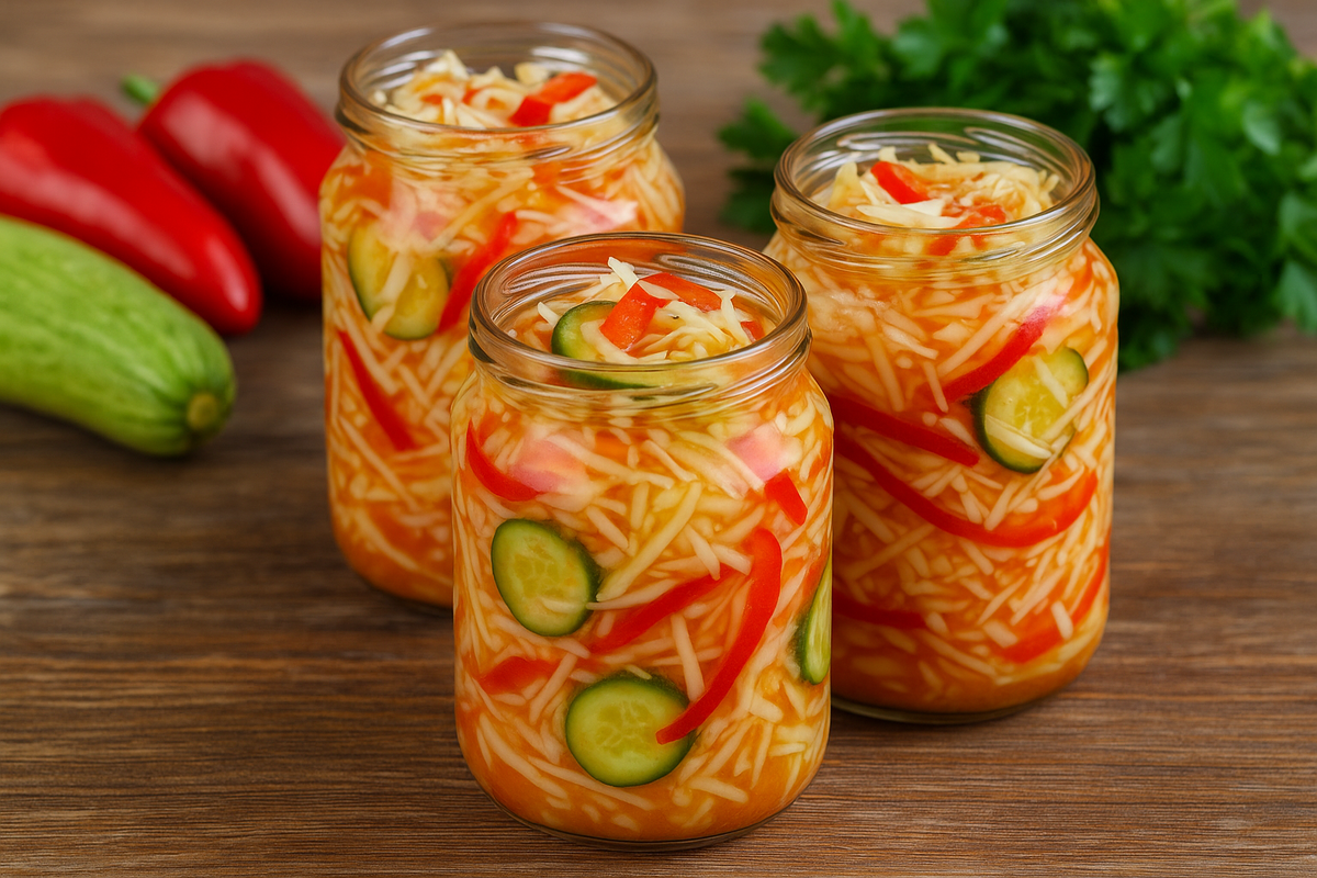 Один из самых удачных вариантов — это салат из капусты, огурцов и перца на зиму. Лёгкий, хрустящий, ароматный и невероятно аппетитный. Он не только радует вкусом, но и отлично сохраняется — всё благодаря правильному маринаду и свежим ингредиентам.