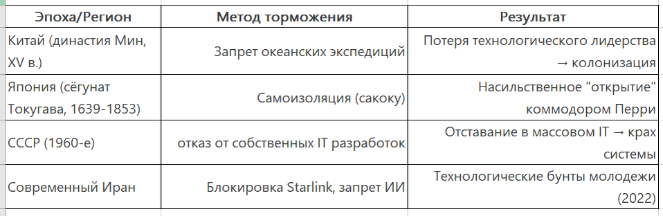 Пример: Китай XV века (запрет океанских плаваний) → через 400 лет колонизация Европой.