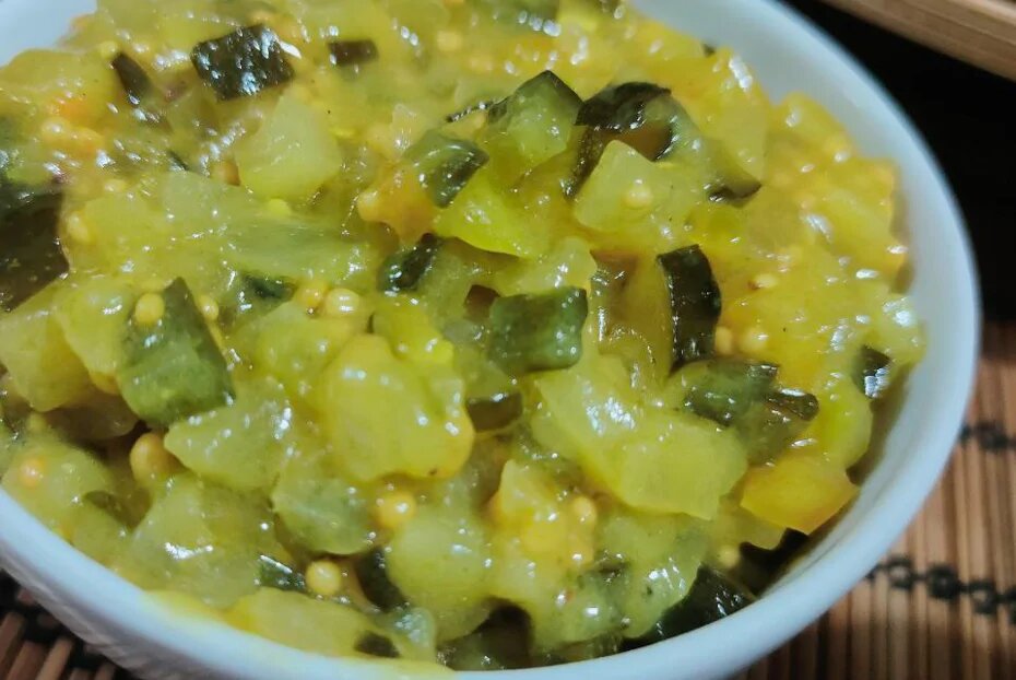 Это один из самых популярных соусов. Подходит к любым блюдам, но особенно хорош в бургерах и хот-догах. Он вообще подойдет к любым блюдам. Отлично хранится и может быть сделан для быстрого употребления. Главное и самое неудобное здесь — это мелкая нарезка овощей. Кстати, перец можно взять красный, тогда соус получится наряднее. Куркума в соусе используется исключительно для цвета, если вы не переносите ее, то можно исключить из списка ингредиентов. Смесь горчиц и соуса должна получиться достаточно острой, так что отходить от рецептуры вполне возможно, ведь у всех разные предпочтения. Приятного аппетита! Огурцы 1 кг Сладкий перец 2 штуки Репчатый лук 1 головка Дижонская горчица 2 столовые ложки Горчица 2 столовые ложки Острый тайский соус 1 столовая ложка Соль 1 столовая ложка Сахар 3 столовые ложки Куркума 1 чайная ложка Крахмал 2 столовые ложки Вода 100 мл Растительное масло 100 мл 1.Подготовить основные продукты. 2.Перец очистить от семян и плодоножек. 3.Нарезать сперва соломкой, за