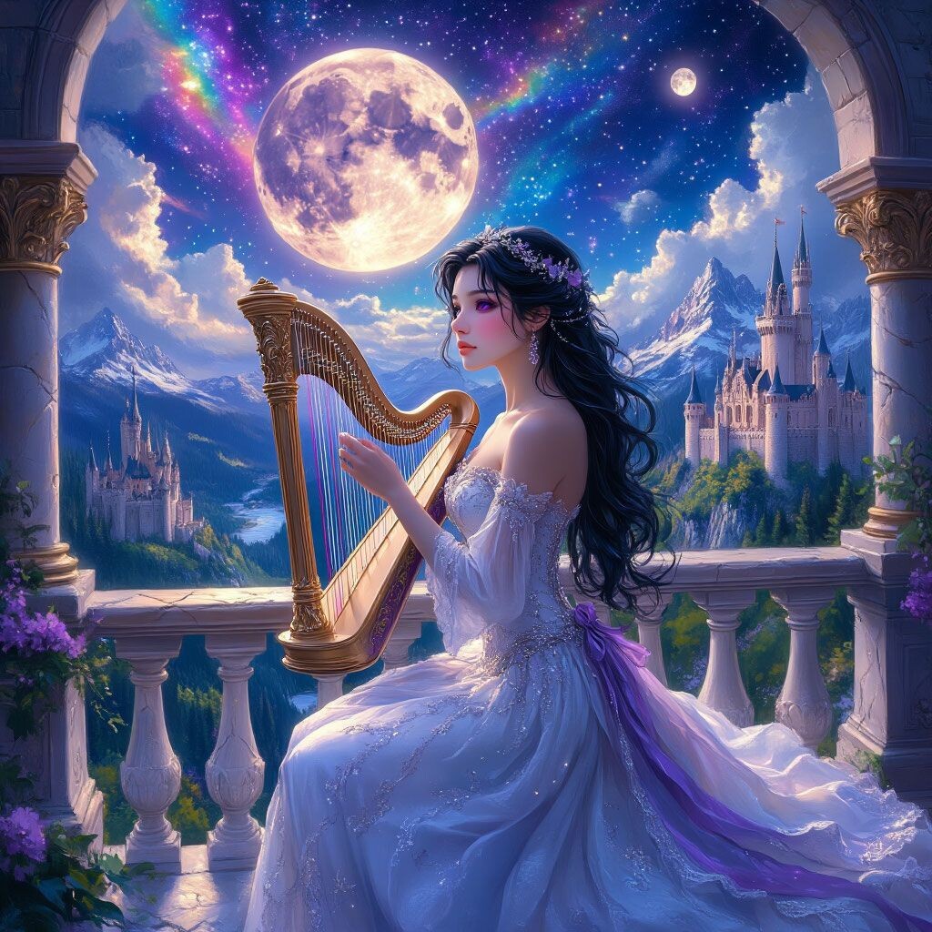 В далёкой-далёкой стране, где горы касаются облаков, а реки текут словно серебряные ленты, стоял удивительный замок с крышей, переливающейся всеми цветами радуги. В его стенах жила юная принцесса Селеста. Её кожа была бела, как первый снег, а волосы черны, как ночное небо, усыпанное звёздами. Глаза принцессы сияли глубоким фиолетовым цветом, словно два драгоценных аметиста. Каждый вечер, когда солнце медленно опускалось за горизонт, окрашивая небо в нежные розовые и золотые тона, Селеста выходила на балкон своего замка. Она играла на серебряной арфе, и её голос, подобный журчанию горного ручья, разносился по всему королевству. Даже дикие звери приходили послушать её песни: лисы выглядывали из-за кустов, олени поднимали головы, а птицы затихали, наслаждаясь музыкой. Но сердце принцессы было печальным — она чувствовала, что в мире есть что-то, чего ей не хватает. Её дни проходили среди роскоши и богатства, но душа томилась по чему-то настоящему и волшебному. Однажды ночью, когда луна св