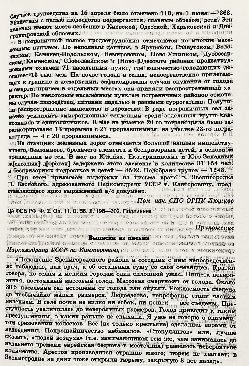 Наличие «продовольственных затруднений», как тогда изящно именовали банальный голод, наблюдалось отнюдь не только на Украине, но в данном случае нам в первую очередь интересно не само сообщение (хотя к нему мы ещё вернемся), а приложение к нему - выдержки из письма врача г. Звенигородка Блонского, адресованного Наркомздраву УССР т. Канторовичу: