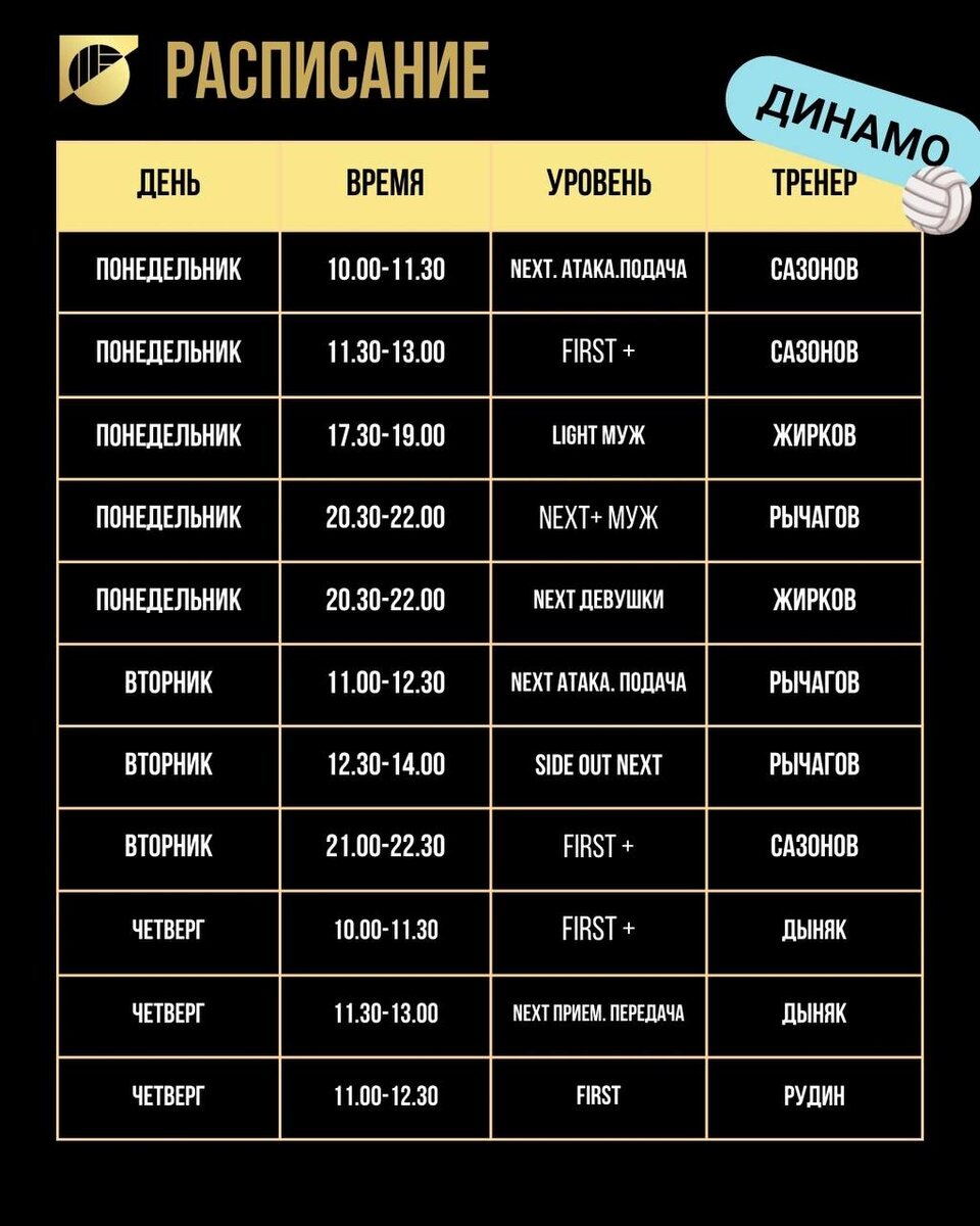 ⚡Расписание клуба Team Krasilnikov на сентябрь для взрослых ➖6 локаций: "Spot", "Динамо", "Пляж", "Динамит", "Песок", "Оптик". ⭐10 профессиональных тренеров, мотивирующих и ведущих к результатам. 🔣6 уровней, занятия для волейболистов с любой подготовкой: First (новички) First+ Next Next+ Light Medium ➕Отдельные тренировки для микстовых пар ➕Игровые в формате Side-out для эффективной подготовки к турнирам. ❗️Важно: Начинаем тренироваться: "Динамит" со 2.09 "Песок" с 5.09 "Пляж", "Оптик", "Spot" - с 10.09| До этого времени продолжаем заниматься на открытых кортах "Динамо" по летнему расписанию. 🔣Для записи на тренировку отправьте сообщение нам в бот.