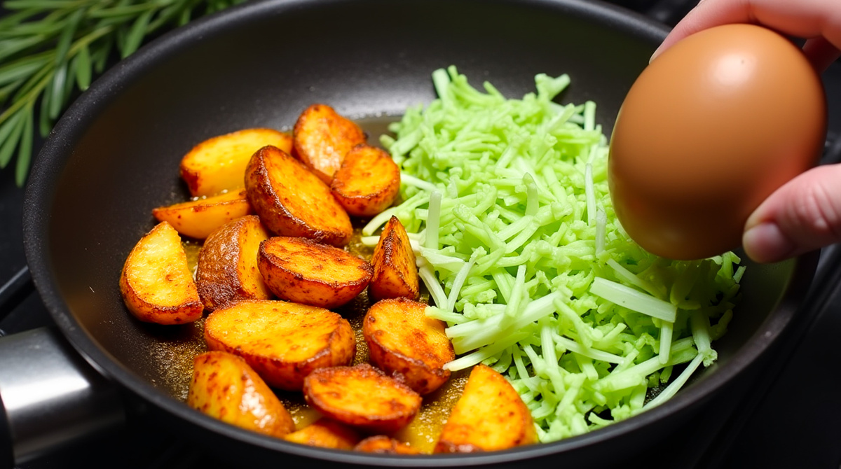 Это блюдо на сковороде — настоящий хит для сытного завтрака или ужина. Без сложных шагов и лишней посуды — всё готовится в одной сковороде. Очищаю 3–4 картофелины, нарезаю и обжариваю на сковороде с растительным маслом на среднем огне. Посыпаю солью и копчёной паприкой, перемешиваю. В миске разбиваю 4 яйца, добавляю соль, перец и перемешиваю. Вливаю 200 г греческого йогурта и снова перемешиваю. Нарезаю 100 г помидоров черри и добавляю в яичную массу. Шинкую 300 г капусты и выкладываю её в сковороду поверх картошки. Сверху заливаю яично-йогуртной смесью. Накрываю крышкой и жарю 10 минут на малом огне. Затем натираю 100 г сыра и посыпаю сверху. Снова накрываю крышкой и готовлю ещё 5 минут. Блюдо готово — получается нежная, сочная овощная лепёшка с расплавленным сыром. Её удобно разрезать на порции, брать с собой или подавать горячей. Ингредиенты: