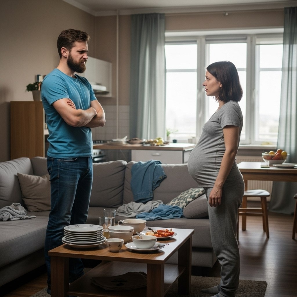 Дома — бардак. Грязная посуда, носки по углам, пивные банки на столе. Села на кухне и разревелась. Живот тянуло, малыш пинался, будто чувствовал моё состояние.