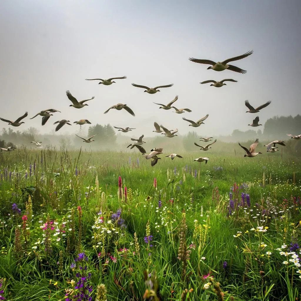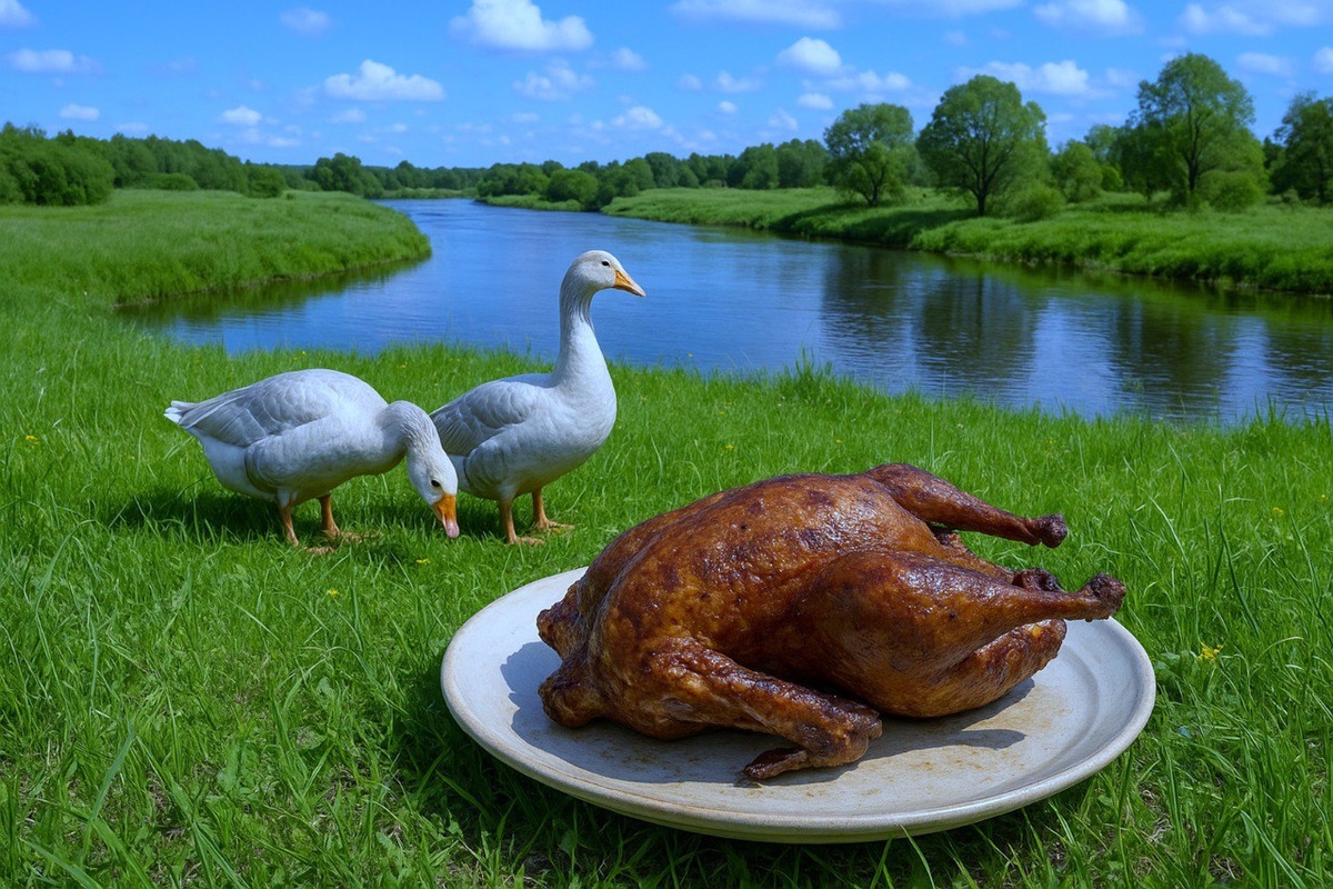 Прожив долгую жизнь, вспоминается мне многое плохое и хорошее. Помню, как в студенческие годы моя мама прислала в посылке 2-х запечённых гусей. Это был 1952 год, я училась в Советске, Калининградской области, в школе киномехаников. А мама жила в Смоленской области, в районном городе Красный. Держала она, как и многие соседи: гусей, уток и кур. У нас там такое раздолье! Примерно такой луг, который изобразил ИИ на этом фото. За нашими огородами начинается большой заливной луг, а ниже протекает река. Утром открываешь сарай: гуси, утки и куры криком вылетают во двор. Гуси идут на луг, к реке. Там они проводят целый день до захода солнца. Удивительно то, что они сами возвращаются домой в свою калитку. Мы пасли их, пока они были маленькие. В те времена с родственниками общались только письмами. Я часто писала домой письма и получала ответы. Письма, письмами, а тут пришло извещение на посылку. Глазам своим не поверила. У нас ещё никто не по