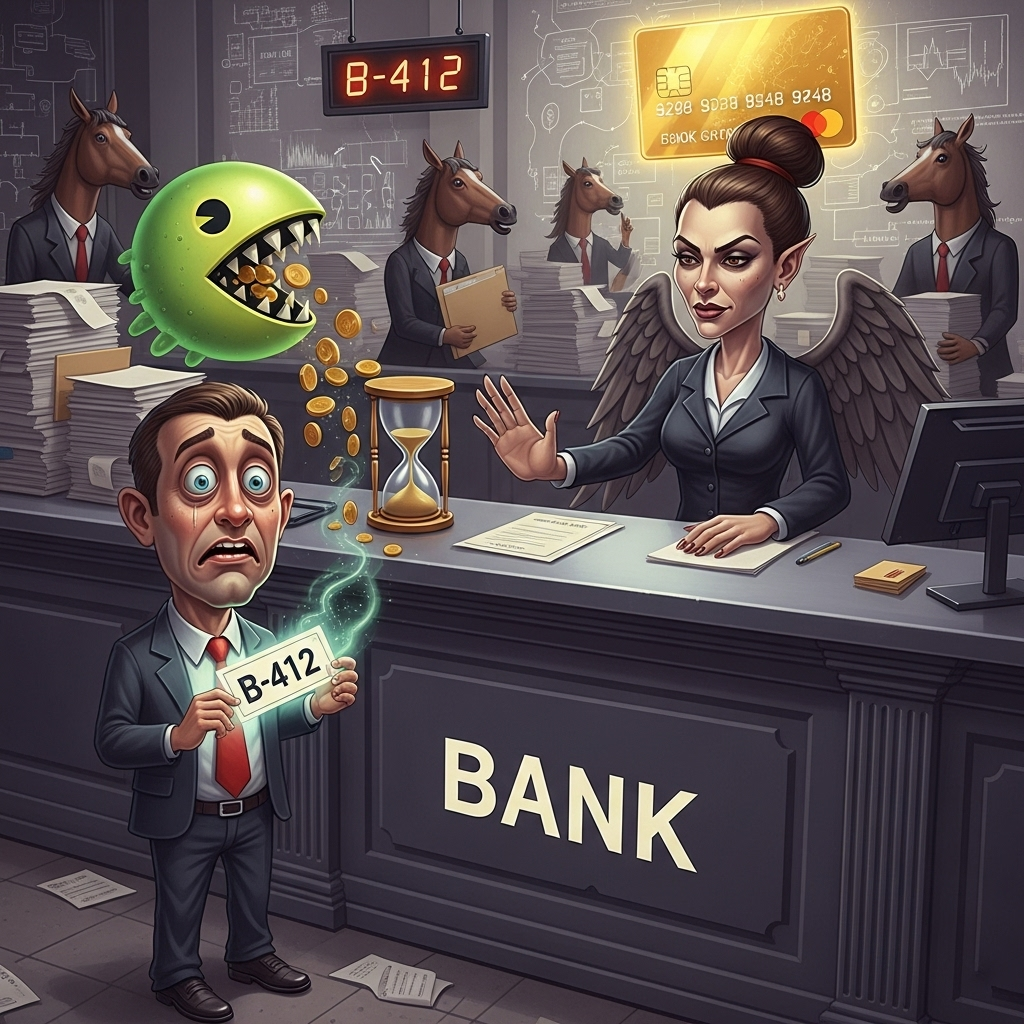 Банк встретил меня стерильной прохладой кондиционера и дежурной улыбкой администратора, чей взгляд, отточенный до автоматизма, пронзил меня насквозь ещё у двери. Это был взгляд существа, уже давно постигшего, что все мы — всего лишь временные носители денежной массы, и её нужно изъять с минимальными издержками. Девушка, поколдовав над своим терминалом, как средневековая алхимичка у тигля, извлекла из недр машины священный Грааль — бумажный талончик с номером. Судьба моя была запечатана под цифрой «Б-412». Я поймал себя на мысли, что цифры на билете смотрят на меня с большим участием, чем живой человек напротив.