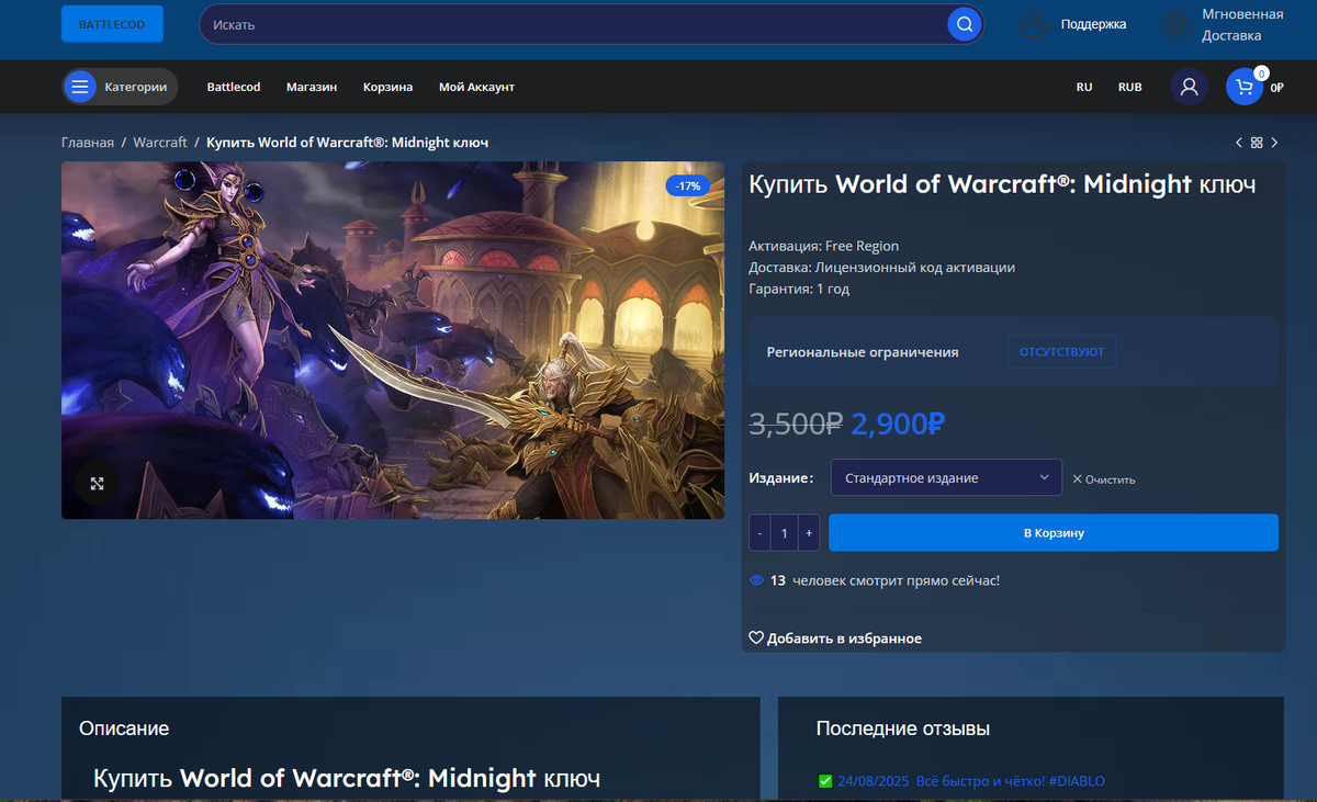 После долгой паузы я решил вернуться в World of Warcraft и начать с актуальной главы — World of Warcraft®: Midnight. Цифровой ключ оформил в интернет-магазине https://blizin.ru/: этот сервис для меня давно в списке надёжных площадок, поэтому выбор был очевиден. https://blizin.ru/ Код пришёл оперативно, активация на аккаунте заняла пару минут и прошла без каких-либо сложностей. Запустив игру, я сразу почувствовал знакомую атмосферу: новые зоны, цепочки заданий и бодрый темп прокачки. Ностальгия включилась моментально — словно снова надел старую роль и продолжил историю, прерванную когда-то давно. Особенно порадовало общение: удалось встретить прежних товарищей и параллельно познакомиться с новичками. Совместные квесты, подземелья и неожиданные бои снова дарили то самое волнение, когда каждая стычка превращается в маленькое приключение. Отдельно отмечу стоимость — цена ключа вышла более чем адекватной. За вполне умеренную сумму я получил доступ к большому объёму контента и многим часа