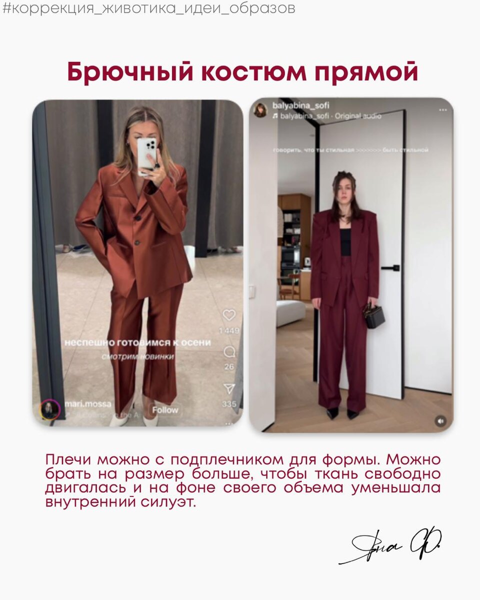 Получила анонимный вопрос: «Как скрыть беременный животик, чтобы никто не догадался об интересном положении? Нужно, чтобы подходило и для работы, и на осень — тёплую и прохладную». На самом деле, «животик» есть у многих из нас. Даже я, при том что регулярно тренируюсь, замечаю у себя эту уязвимую зону😮💨 Поэтому смотрим приёмы, которые работают на коррекцию и отвлечение внимания. Образы в подборке – в основном для офиса, и частично для повседневности. Главное правило: мы не маскируем тело, а переводим внимание на другие части тела. Для этого работаем именно с акцентами: через фасоны, слои, линии, цвет. Костюм с прямыми линиями работает как каркас. Пиджак можно брать чуть свободнее: его объём скрадывает внутренний силуэт и создаёт актуальный расслабленный образ. Важна вертикаль: пиджак оставляем расстёгнутым, а бермуды подбираем либо в тон пиджака, либо в тон топа. Это визуально вытягивает силуэт. Длина пиджака — до середины ягодиц. Играем на контрастах: Форма жилета с V-образным выр