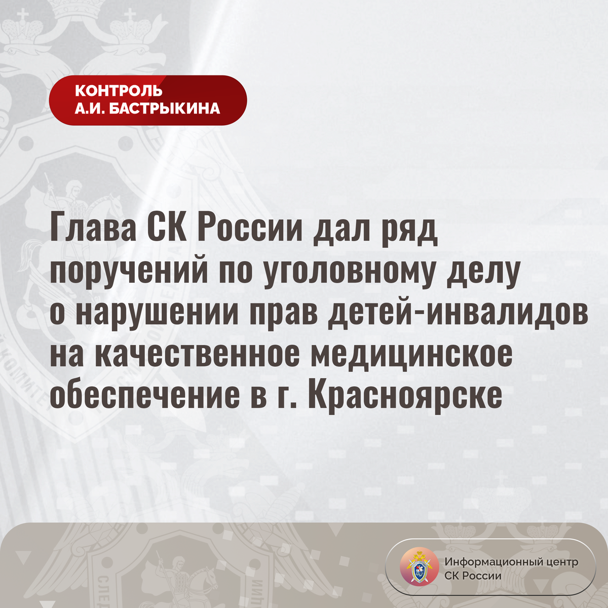 Глава СК России дал ряд поручений по уголовному делу о нарушении прав детей-инвалидов на качественное медицинское обеспечение в г. Красноярске В Информационный центр СК России обратилась жительница города Красноярска по вопросу нарушения прав ее сыновей, являющихся инвалидами, на качественное медицинское обеспечение. Дети нуждаются в регулярной медикаментозной терапии, однако с мая текущего года они необходимый лекарственный препарат не получают. Семье предлагается аналог, прием которого оказывает негативное влияние на состоянии здоровья малолетних. Кроме того, медицинским учреждением отказано в проведении сыновьям заявительницы необходимых обследований. Обращения в различные инстанции результатов не принесли. В ГСУ СК России по Красноярскому краю и Республике Хакасия по данному факту расследуется уголовное дело, по которому ранее А.И. Бастрыкин поручал представить доклад. Председатель Следственного комитета Российской Федерации Александр Иванович Бастрыкин поручил руководителю ГСУ СК