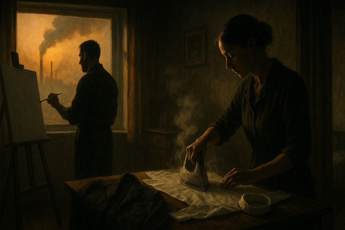 Рев фабричной сирены – глотка медного зверя, вырвавшегося из утренней дымки, – разорвал сон Марка, словно грубую ткань. Отец уже там, у мольберта, непоколебимый утес в этом утреннем шторме света и тени, холст – белое зияние, ждущее, чтобы его заполнили. Мать, тихая гавань в буре будней, гладит, гладит, гладит, безмолвно, как река, текущая сквозь века, его рубашку, накрахмаленную до хрустальности зимнего льда, воротник – сатин, скользкий и прохладный под пальцами, которые, как крошечные ловкие птички, пришивают его к грубому сукну пиджака, школьной броне.