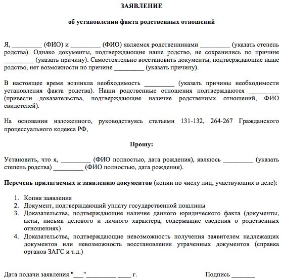 Чтобы суд рассмотрел обращение об установлении родства с умершим родственником, предстоит подготовить заявление. Документ оформляется с учетом требований статьи 131 ГПК РФ. В него вносят следующую информацию: