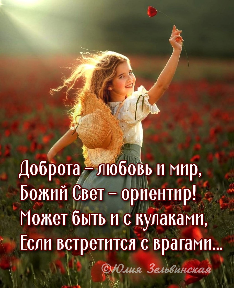 Что такое доброта? Попустительство греха? Почему-то лоховатость Путают со словом святость. Доброта – любовь и мир, Божий Свет – ориентир! Может быть и с кулаками, Если встретится с врагами… В чём отличие от зла? Многим людям помогла: Радость жизни созидает И в беде не оставляет. Уважает всех людей, Помогает стать мудрей (Мудрость чувствует границы, Смотрит вглубь, а не на лица). Жизнь в гармонии любви: Твёрдость с мягкостью внутри (Люди добрые – не мямли, Чтоб другие не подмяли). Доброте неведом страх, Хоть не в розовых очках… И не только лишь мечтает: Ставит цель – и достигает! Часто добрый человек В жизни тактик и стратег. Не ленивый, работящий, Искренний и настоящий. Доброта – небесный дар, Сердца нашего нектар. В испытаньях очевидно: Добрый мыслит дальновидно! ©Юлия Зельвинская