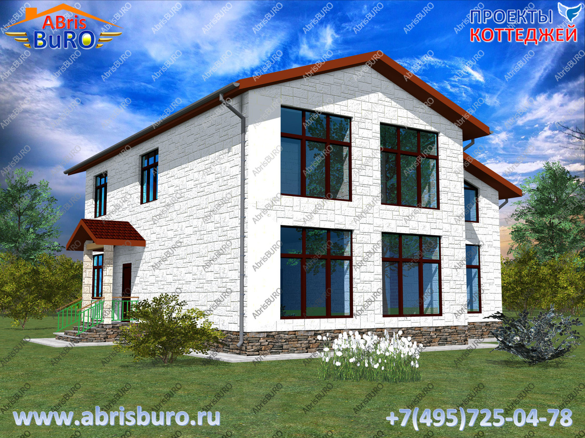 K2164-240 Проект двухэтажного коттеджа с двумя жилыми блоками, большими окнами, 4 спальнями, сауной, зимним садом и двухскатной крышей общей площадью 240,3 м2 и габаритными размерами 12,0 х 14,0 м. Фундаменты - монолитная ж/б плита, стены из газобетонных блоков, перекрытия - сборные ж/б плиты, крыша из металлочерепицы. Автор оригинального проекта 2-х этажного дома - архитектурная фирма ABRISBURO-проект коттеджей.