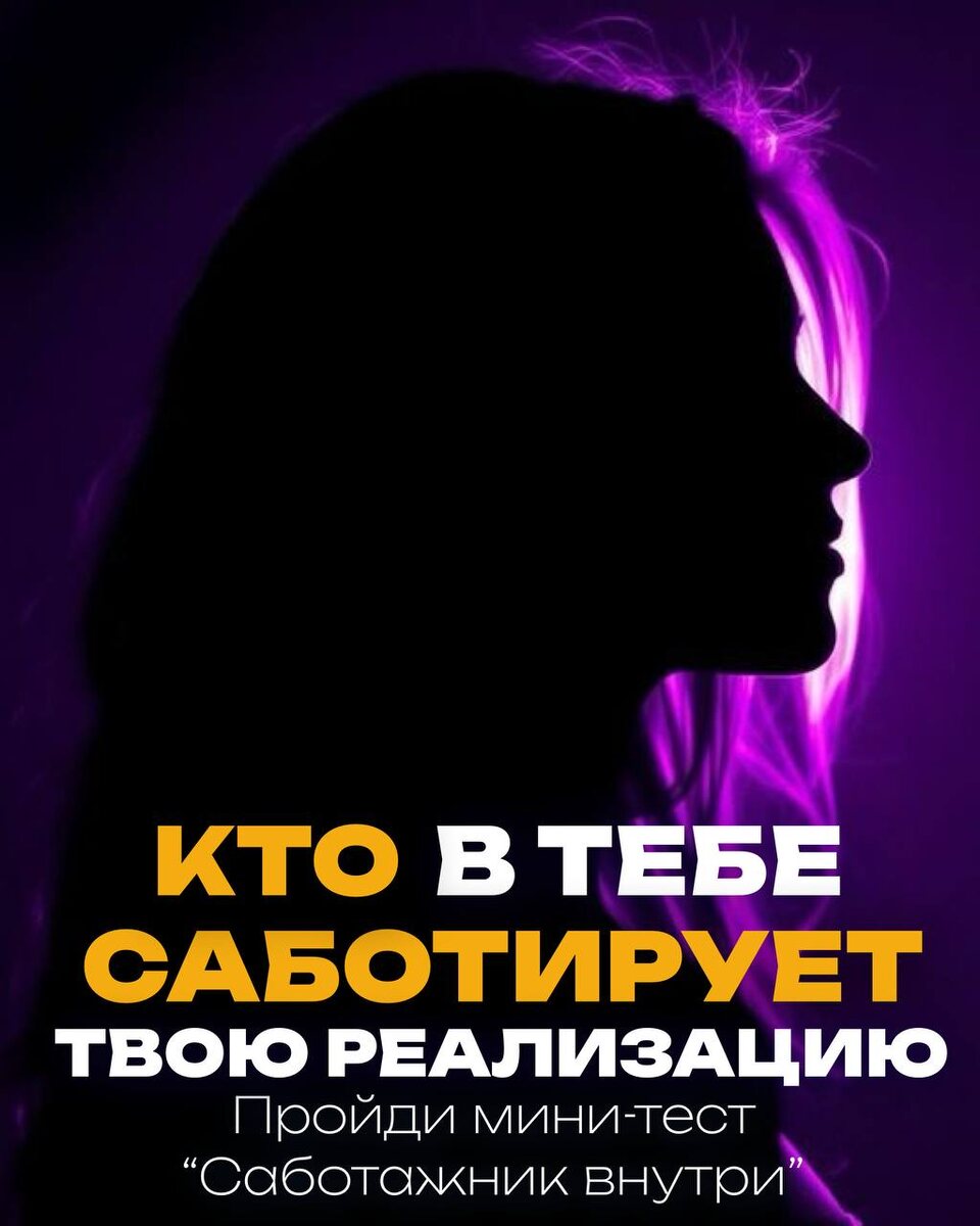 Мне постоянно задают один и тот же вопрос: Как достичь самореализации? Особенно часто приходит этот вопрос от женщин. Поэтому этот пост адресован женщине. Ты знаешь, что способна на большее. У тебя были идеи, вдохновение, внутренние “ДА”, но... Но всё снова превращается в откладывание, сомнения, откат… Что-то внутри будто нажимает на тормоз. Ты знаешь, что ты не глупая. Не ленивая. Не слабая. Но как только ты приближаешься к настоящему проявлению себя, внутри обязательно будто кто-то глушит свет. - Кто в тебе тормозит твою реализацию? - Какой “постулат” до сих пор управляет твоим выбором? - Где в теле у тебя блокируется энергия действий? Это не просто викторина. Это зеркало, в которое ты давно боялась посмотреть. После него ты получишь расшифровку и поймёшь, где внутри ты отключила свою волю. 👉 Ссылка на тест: “САБОТАЖНИК ВНУТРИ ”. 🧩 Обычно женщины проходят его и говорят: “Ужасно точный. Словно кто-то подслушал мои мысли.” @markifraimov