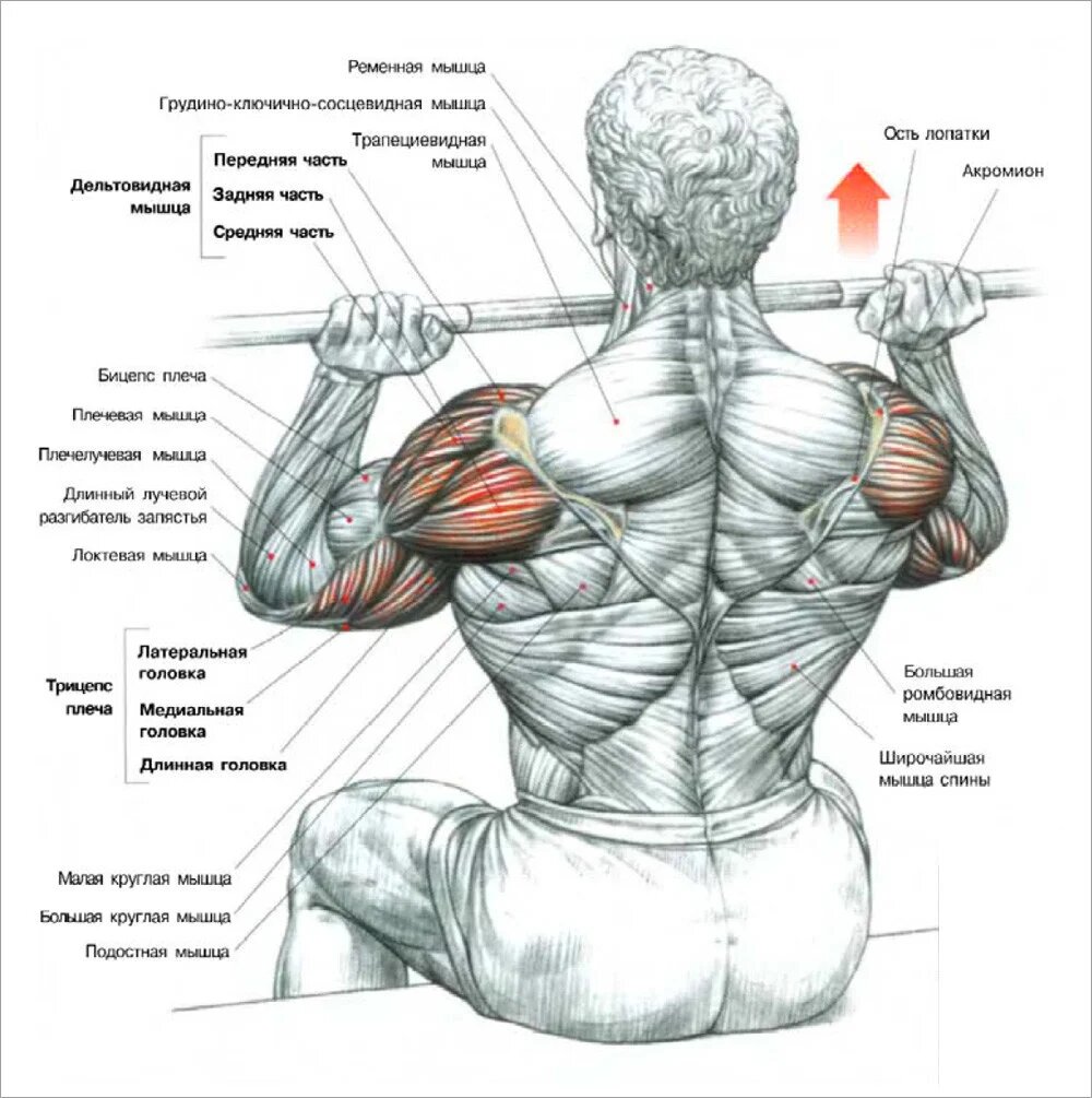 Подъём штанги над головой сидя (жим штанги сидя над головой) — базовое упражнение для развития мышц плечевого пояса. Задействует дельтовидные мышцы, трицепсы и верхнюю часть грудных мышц. Преимущества: Исходное положение: сесть на скамью с опорой для спины, поставить ступни на пол и выпрямить спину, прижавшись к скамье. Взяться за штангу обеими руками, расположив их чуть шире ширины плеч. Поднять штангу со стойки и удерживать её на уровне плеч, локти должны находиться прямо под запястьями. Напрячь мышцы кора и контролируемо выжать штангу над головой до полного выпрямления рук. Коротко задержаться в верхней точке, убедившись, что плечи опущены и отведены от ушей. Опустить штангу обратно на уровень плеч, сохраняя контроль и правильную осанку. Повторить необходимое количество раз, поддерживая ровный темп на протяжении всего подхода. Советы: Некоторые ошибки, которые не следует допускать: Упражнение не подойдёт при заболеваниях суставов (остеоартрозе, импиджмент-синдроме, проб