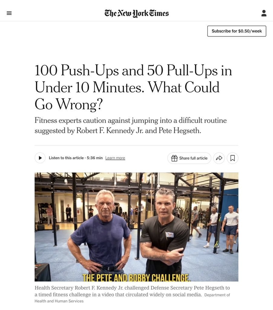 В ответ на пост Want to try RFK’s cool fitness challenge? The New York Times’ ‘fitness experts’ say DON’T Reckon NYT journos are just jealous they’d get smoked by a 71-year-old man?