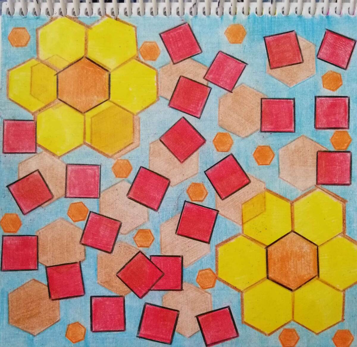 День 13.Если надо систематизировать мысли-рисуй соты или квадраты. Сегодня я решила продолжить исследование своих эмоций и состояний, но с новым подходом. Вдохновившись структурой и симметрией, я выбрала рисовать соты. Эта форма не только эстетически приятна, но и символизирует порядок и гармонию, что так важно в нашем внутреннем мире. ▎Структура моих эмоций Я разделила лист на несколько больших шестиугольников, каждый из которых представляет отдельное эмоциональное состояние, которое я испытываю в последнее время. 1. Сота радости: В этом сегменте я использовала яркие, теплые цвета — желтый и оранжевый. Эти оттенки вызывают у меня чувство счастья и легкости. Я добавила мелкие детали — маленькие цветочки и солнечные лучики, которые отражают моменты радости в повседневной жизни. 2. Сота тревоги: Здесь я выбрала более темные и холодные цвета — синий и серый. Я нарисовала волны, которые символизируют бурю в душе. Это состояние заставляет меня чувствовать себя неуверенно, но важно осознать