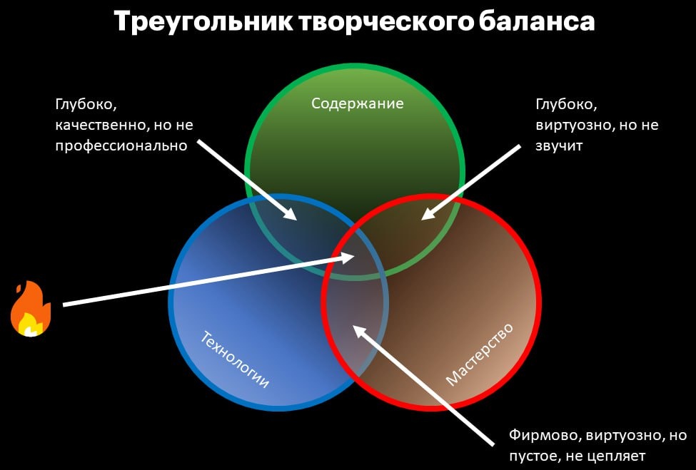Поиск творческого баланса На днях консультировал одного музыканта и снова вернулись к теме творческого баланса. Поэтому решил в очередной раз напомнить об этом. Создавая музыку у нас всегда есть три основные составляющие творческого процесса: 🎛 Содержание — что мы закладываем в музыку на уровне смыслов, состояния, эмоций, переживаний, истории. То, что автор несёт и выражает в своей музыке, месседж. 🎛 Мастерство — владение музыкальным языком, композиторские и исполнительные навыки, умение писать партии, аранжировать, подбирать звуки и так далее. 🎛 Технологии — инструменты, которые мы используем в работе (музыкальные инструменты, эффекты, DAW), а также технологическая часть процесса — запись, сведение, мастеринг. Очень важно найти баланс между этими составляющими, так как если одна из них проседает, то начинаются проблемы. Например, у трека глубокая идея, мы его здорово аранжировали, круто исполнили, но плохо свели, и он попросту не звучит. В этом случае мы похоронили идею, содерж