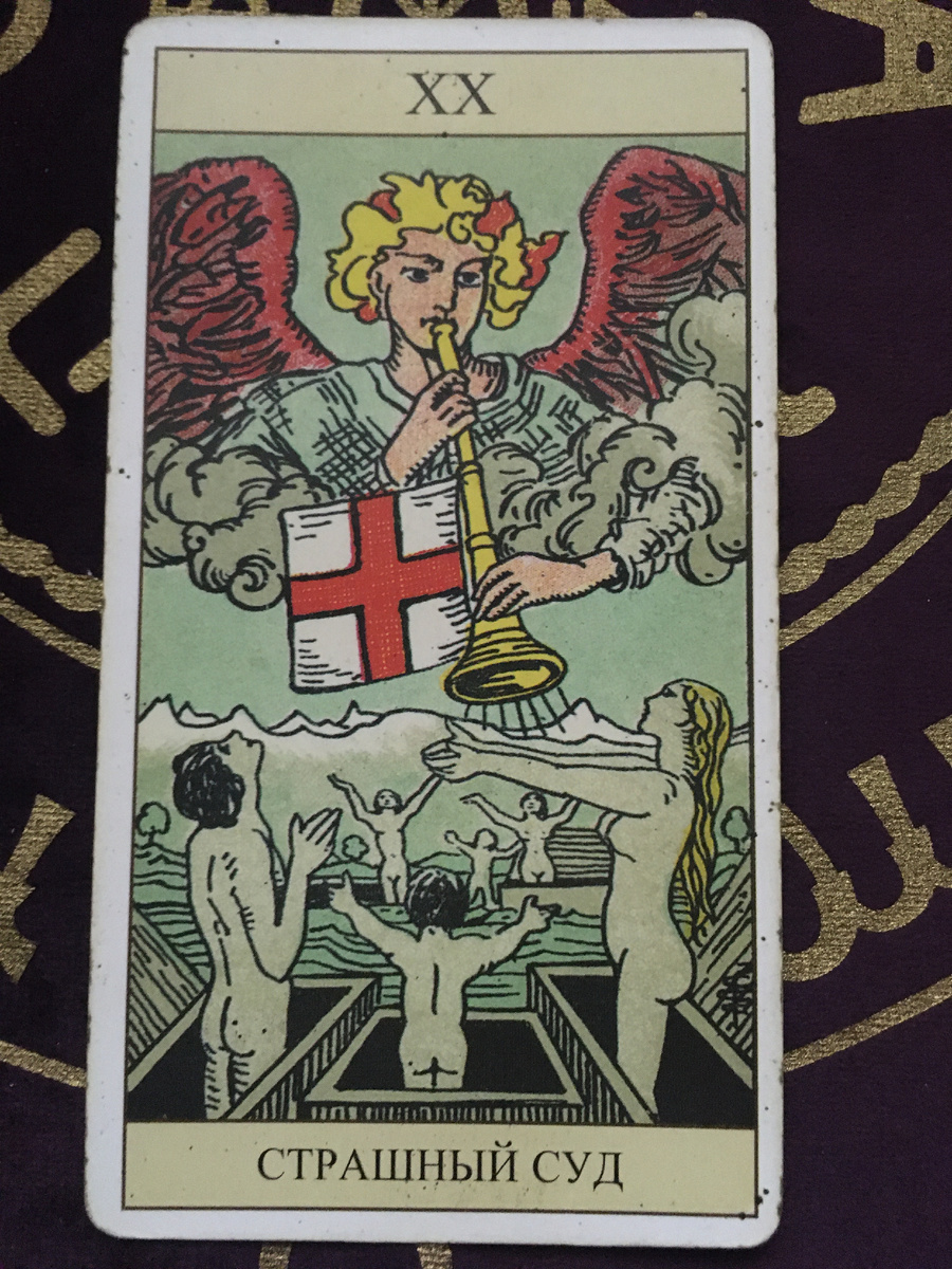 Мы достигли пика личного развития и просветления с арканом Солнце. Но что, если наше личное счастье — не конечная точка? Что, если нас ждет зов, который призывает выйти за пределы собственного «Я» и ответить на вопрос: «Зачем?». Встречайте архетип высшего призвания, кармического отчета и экзистенциального пробуждения — Суд (или Страшный Суд). Пробуждение по Зову Свыше На карте мы видим мощную сцену: архангел Гавриил (вестник божественной воли) трубит в горн, с которого развевается знамя с крестом — символ вознесения и соединения духа и материи. Под звуки этой трубы могилы раскрываются, и восстают мертвые — мужчины, женщины, дети — простирая руки к небу в едином порыве. Они встают из вод бессознательного (океан) на сушу осознанности, знак их духовного воскрешения. Суд — это архетип Призвания, Пробуждения, Подведения Итогов и Абсолютного Преображения. Это не страшный суд как наказание, а момент истины, когда наша душа получает зов от высшего «Я» и должна дать ответ. Это финальная переоце
