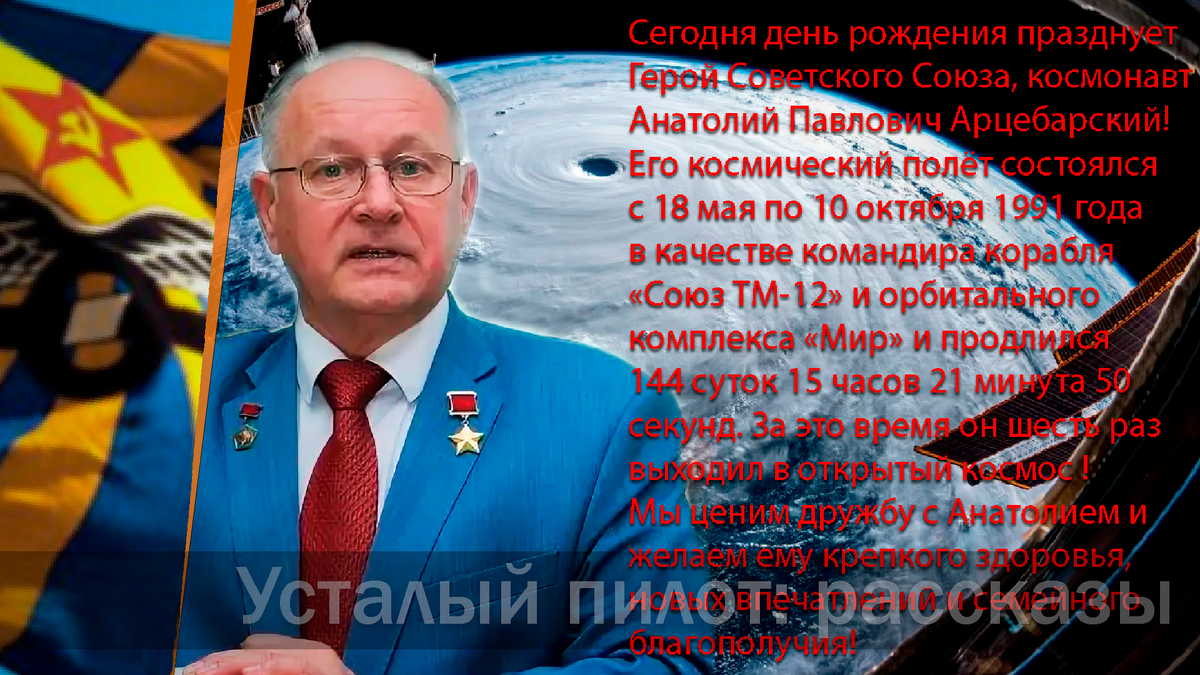 Сегодня отмечает День рождения Анатолий Павлович Арцебарский, водрузивший над нашей планетой Земля красное знамя Союза Советских Социалистический Республик в 1991 году. И он действительно получил звание Героя Советского Союза последним из космонавтов, дальше космонавты получали звание Героя России, всем известно после каких событий.