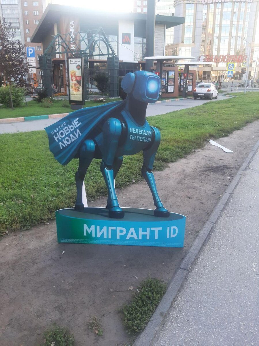 По мере того, как выборы в горсовет Новосибирска и областное Заксобрание становятся ближе, политическая кампания продолжает набирать обороты. Следом за плакатами, билбордами и граффити в агитационную работу включились и скульптуры, пускай пока еще двухмерные. Вот такой пример агитации прислали сегодня читатели Сиб.фм. Робот-собачка (которая кому-то может напомнить одного из «персонажей» сериала «Черное зеркало») в супергеройском плаще агитирует за «Новых людей» около станции метро «Березовая роща». Слоган на этой скульптуре используется простой: «Нелегал, ты попал». На постаменте пояснено: речь идет о внедрении системы «Мигрант ID», обязательной для всех иностранцев, работающих на территории РФ. Установка необычной скульптуры вызвала неоднозначную реакцию среди горожан. Одни считают, что это креативный и запоминающийся способ привлечь внимание к важной проблеме. Другие же высказывают опасения по поводу возможного разжигания межнациональной розни и излишней радикализации предвыборной ри